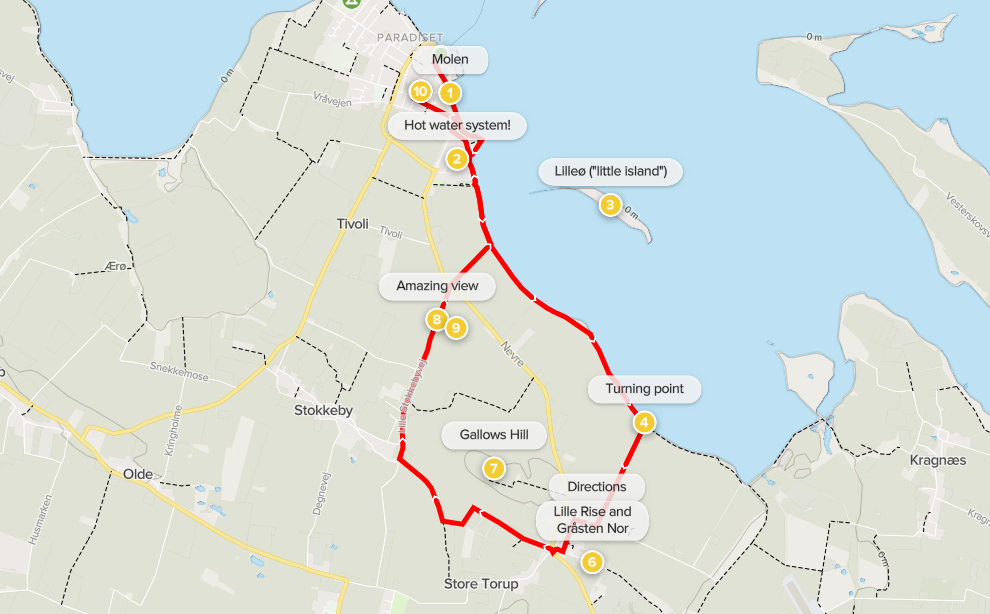 The route starts by the harbour - the bus stop is there too and there is parking. Ærøskøbing is also the best place on the island for accommodation and restaurants.